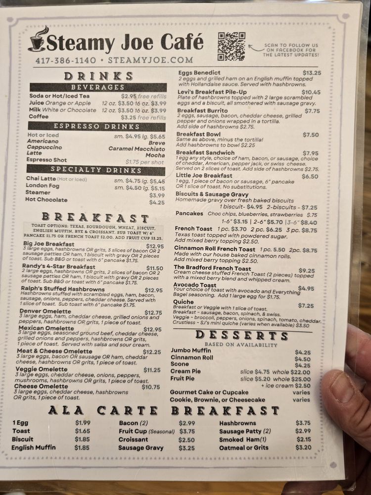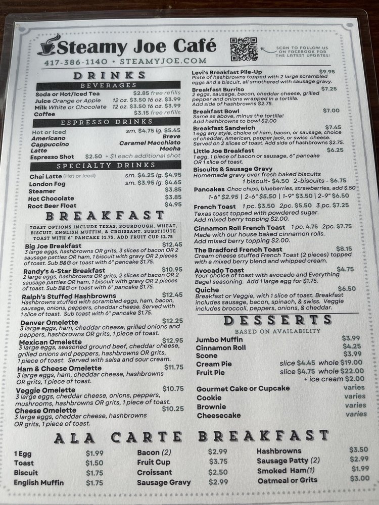 Located in Branson, MO, Steamy Joe Cafe is a delightful spot for breakfast and brunch enthusiasts. The menu highlights include an extensive array of mouthwatering wraps, hearty breakfast items, and delectable bakery treats. Customers rave about the best sausage gravy in town, paired perfectly with their biscuit-loaded specials featuring succulent sausage and vibrant peppers.